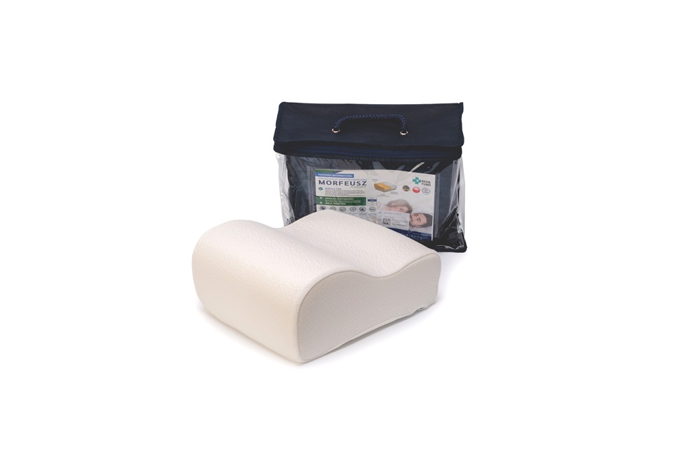 Poduszka ortopedyczna Morfeusz Podróżny zapewnia odpowiednie podparcie i prawidłową pozycję odcinka szyjnego kręgosłupa oraz głowy podczas snu. Dzięki zastosowaniu pianki termoelastycznej („z pamięcią”) poduszka doskonale dopasowuje się do ciała pod wpływem jego ciężaru i temperatury. Mała i poręczna – idealna, aby zabrać ją ze sobą w podróż. Szczególnie zalecana dla osób wymagających profilaktyki zdrowego snu, mających zwyrodnienia w odcinku szyjnym kręgosłupa. Przeznaczona dla osób śpiących na wznak lub na boku. Nie powoduje zbędnego nacisku mogącego prowadzić do odgnieceń, co daje poczucie wyjątkowego komfortu. Dodatkowo poduszka posiada regulację wysokości. Jeśli poduszka jest za niska wystarczy włożyć podkładkę podwyższającą z pianki. Poduszka umożliwia spanie na plecach lub na boku oraz pozwala na indywidualne dopasowanie jej do budowy ciała.